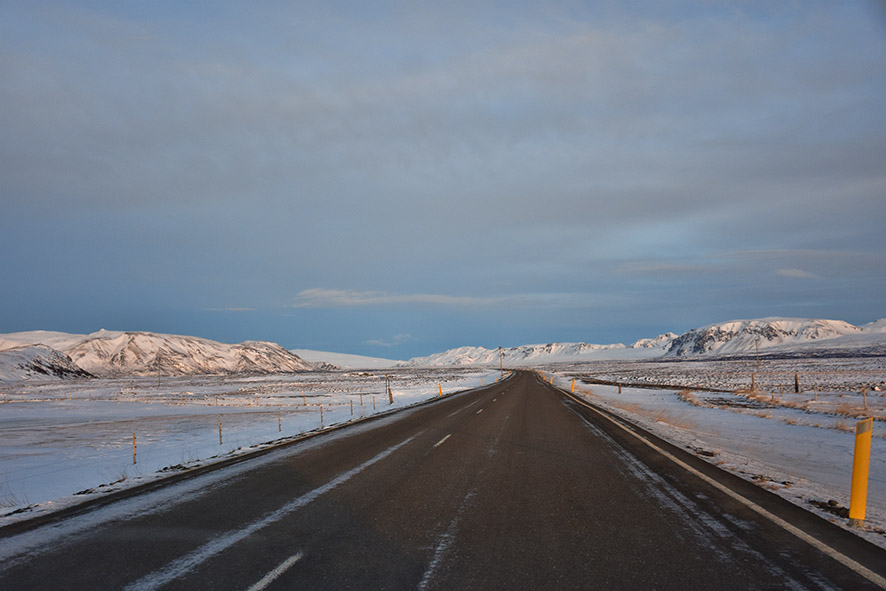 Als we gaan dalen kan ik IJsland vanuit het vliegtuigraam zien en het is écht IJsland (uiteraard). Een compleet wit land met de weg als een zwarte streep erdoorheen. Dat had ik niet verwacht, dat er zoveel sneeuw zou liggen! Ik stap uit en een koude wind slaat me om de oren, de piloot zei al er een windje stond. Op het vliegveld ga ik de auto halen en de man achter de balie overtuigt me behoorlijk snel van het nut van een iets grotere auto inclusief spikes aan de wielen. Vooruit, doe die er maar bij dan voor 50 euro extra, kan ik in elk geval veilig de weg op.